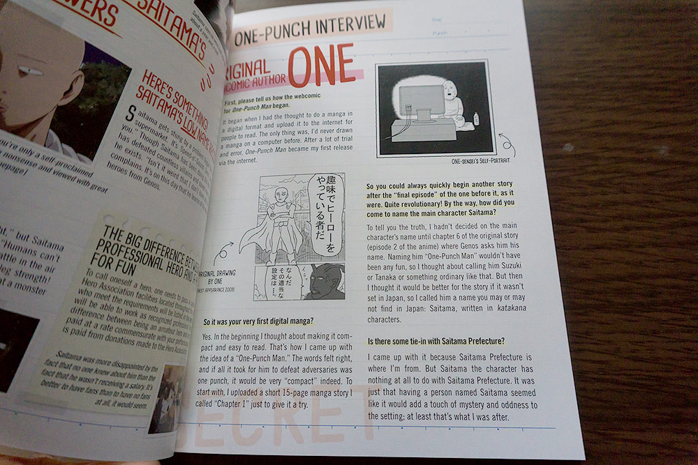 Included in the limited edition set is this booklet titled “One Punch Man Notes”. It’s filled with a lot of great content like character profiles (including all the monsters and bad guys), Genos’s journal, summaries, staff interviews and more. Interviews include notes from the original webcomic author One, the anime director, script writer, character designer and chief animation director and original story writer. You’ll also find the first chapter of the manga at the back. I read this before I watched episode 1 and it’s almost identical!